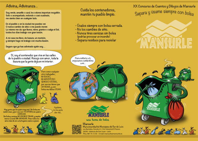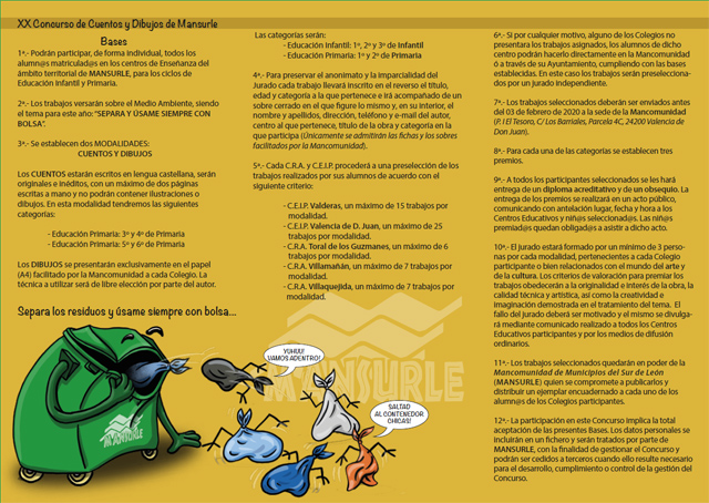 Con esta idea por bandera, se llevarán a cabo varias acciones orientadas a concienciar a los vecinos de la necesidad de usar los contenedores siempre con bolsa. Y que mejor iniciativa que empezar por los más pequeños. Por ello, este año la XX edición del concurso de cuentos y dibujos incidirá en esta idea, siendo el tema propuesto: «Separa y úsame siempre con bolsa». Con este fin se han diseñado unos trípticos que se entregarán a todos los escolares de nuestros pueblos, los cuales incluyen las bases del concurso y las ideas principales que se quieren trasladar a la ciudadanía.