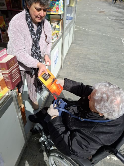 Marie Claude Laborde, residente centenaria del centro geriátrico Lacort en la localidad vallisoletana de Viana de Cega, realiza una visita a Valladolid para acudir, entre otros, a la feria de libro antiguo, donde elige varios volúmenes en su lengua materna